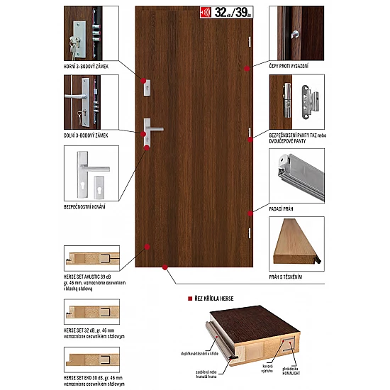 - Dveře HERSE se zárubní s těsněním a dubovým prahem mají vzduchovou neprůzvučnost Rw = 30 dB (za připlatek 32 nebo 39 db), lze je osadit do původní kovové zárubně.