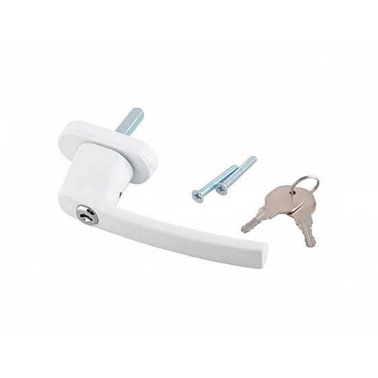 Hliníková bezpečnostní klika uzamykatelná klíčem pro okna a balkónové dveře v bílé barvě. (klika se zámkem, klika s klíčem)